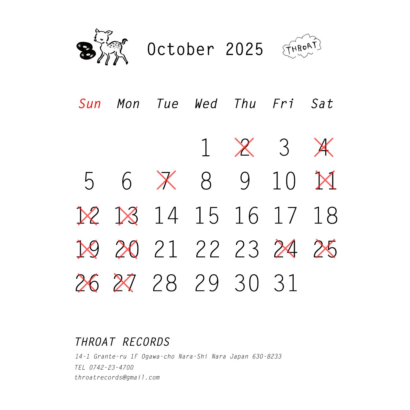 2025年10月のTHROAT RECORDS営業予定になります。※営業日程が少なくご迷惑おかけしており申し訳ありません。