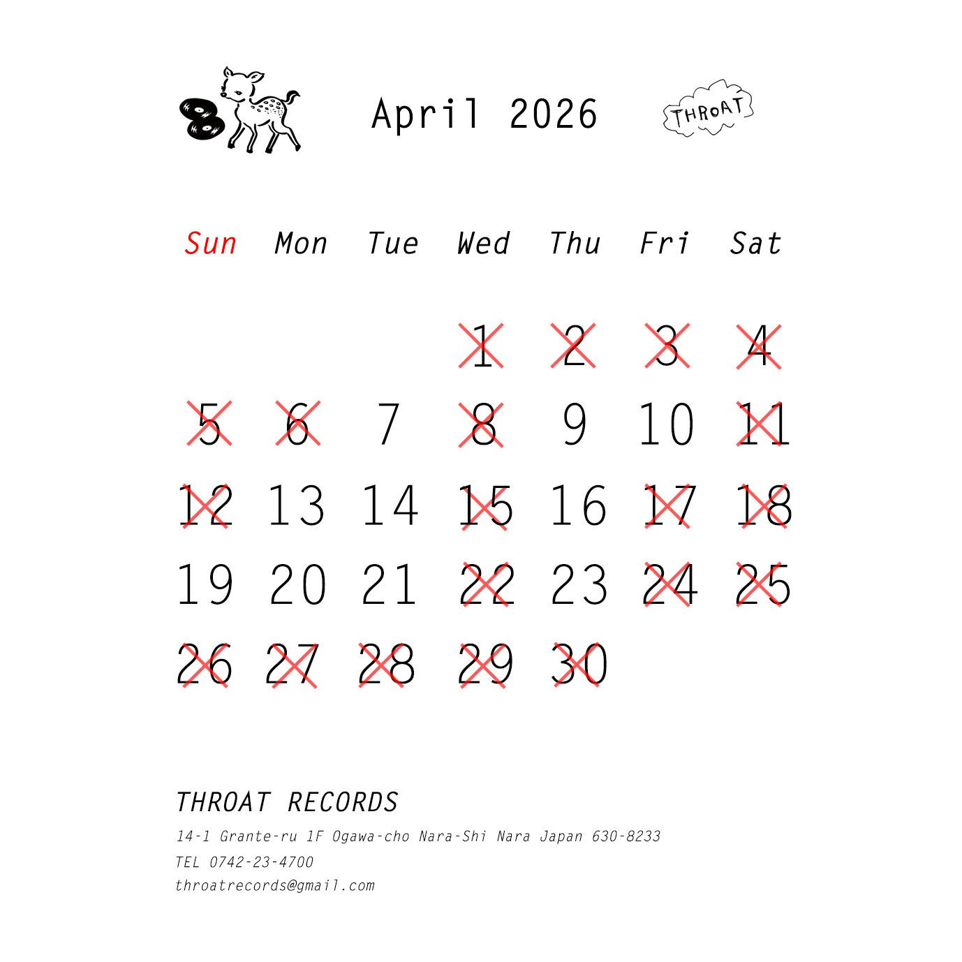 2026年4月のTHROAT RECORDS営業予定日程のカレンダーになります。